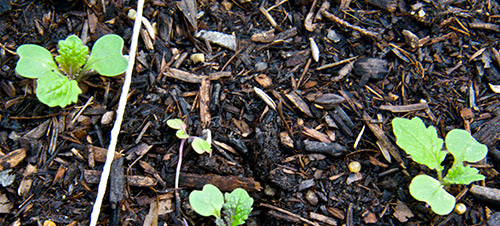 Пока молодые всходы репы не отрастили третьего настоящего листочка, нужно успеть проредить их. Если мы сажали по 2-3 семечка в одну лунку и они все взошли, теперь оставляем только одно, самое сильное растение.