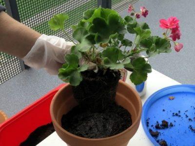 - Из прежнего контейнера достают герань, стараясь не повредить земляной ком. Можно аккуратно действовать ножом, если надо отделить грунт от стенок.