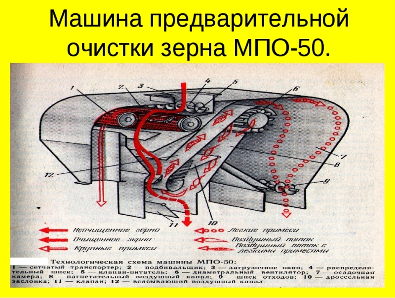 В МПО-50 установлены воздухоочистительные механизмы, которые позволяют избавляться от легких примесей и выводить их в специальные фильтры. То зерно, которое прошло очистку, выводится из машины самотеком.