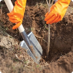 - Засыпать растения до половины высоты ствола землей и уплотнить ее с помощью лопаты.