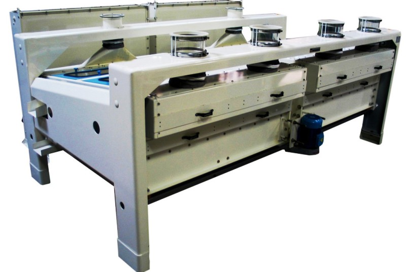 Очищаемая зерновая масса поступает двумя параллельными потоками в секции решетного кузова. Там она при помощи распределителей разделяется еще на два потока. В конечном итоге в сепаратор поступает четыре потока зерна (два в каждую из секций кузова). Из приемного патрубка сепаратора зерно поступает на решето, где при помощи клапана равномерно распределяется по всей его ширине. Крупные примеси выводятся из машины лотком, а зерновая смесь с мелкими примесями идет на подсевное решето. Далее мелкие примеси по дну кузова поступают в лоток, а затем выводятся из сепаратора. Зерно, очищенное от примесей, направляется на вибролоток и в питающую коробку пневматического сепарирующего канала. Высоту уровня зерновой массы в питающей коробке можно регулировать при помощи пружин. Под действием зерновой массы образуется щель между стенкой питающей коробки и вибролотком. Через нее зерно попадает в зону действия потока воздуха. В зону пневматического сепарирования воздух поступает, проходя под вибролотком, при этом происходит выделение из зерновой массы легких примесей, после чего они выносятся в осадочное устройство (фильтр или горизонтальный циклон).