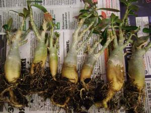 1. Необходимо вынуть адениум из горшка. Растение очищают от грунта и промывают. После того, как корешки подсохли (20-30 мин), их исследуют на предмет гнили.