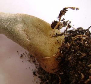 - Следует подрезать у молодого сеянца главный корень и все корешки, которые направлены вниз. После каждого среза необходимо лезвие протирать спиртом, а сок промакивать салфеткой.