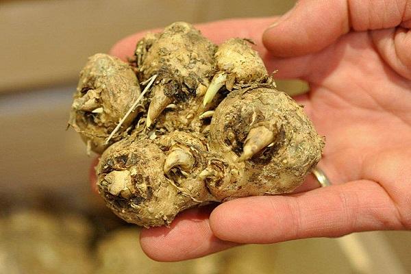 После выкопки клубни очищают от почвы. Лучшим способом будет поместить их в емкость с жидкостью, а после непродолжительного отмокания обмыть под слабой струей воды. Очищать таким способом грязь необходимо аккуратно, чтобы не отломить плохо сформировавшиеся детки.