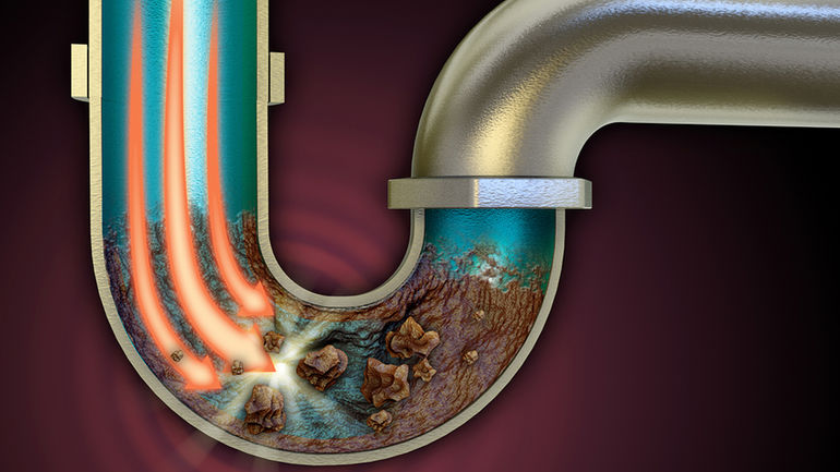Способ для борьбы с засаливанием. Отложение жира на стенках трубы приводит к уменьшению её просвета, где и застревает всякий мелкий мусор. Чаще всего это происходит на кухне. Пробить кипятком засор можно и в отсутствии жировых отложений на трубах. Если тромб небольшой, то горячая вода может нарушить его целостность, и он уйдёт вниз.